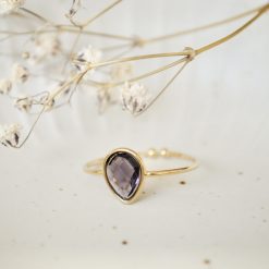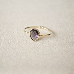 Dieser hochwertige Ring aus vergoldetem Edelstahl begeistert durch sein zartes, filigranes Design und einen auffälligen violetten Zirkonia-Stein in Birnenform. Der Brillantschliff sorgt für ein intensives Funkeln, das bei jeder Bewegung das Licht einfängt. Die feine Fassung betont die elegante Tropfenform des Steins, während der schmale Ringkörper für eine dezente, moderne Note sorgt.